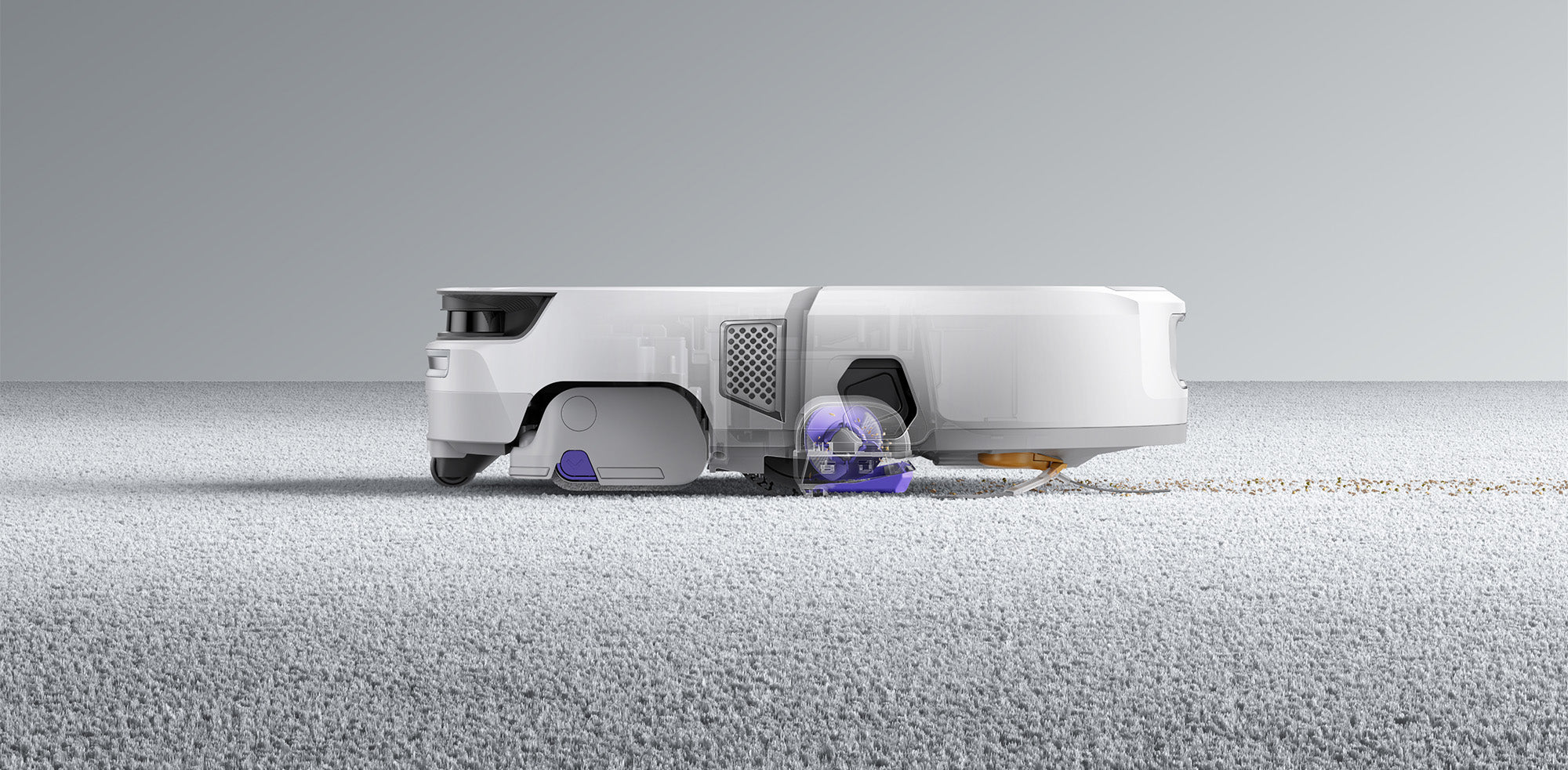 When carpet is detected, the new Narwal Flow forcefully lowers its brush cover to create a sealed high-pressure airflow zone - boosting pickup by 2x more than the industry average.