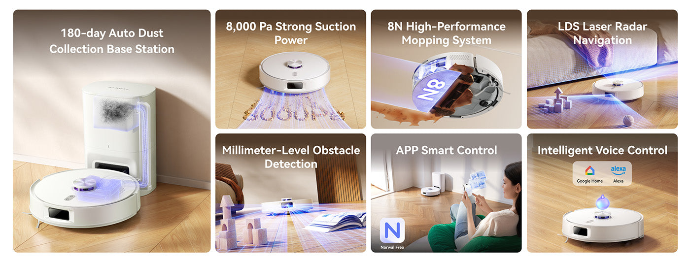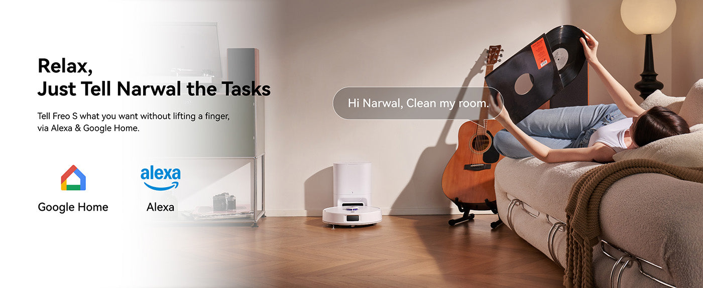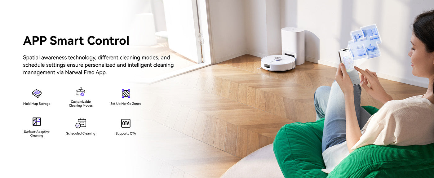 Smart App & Voice Control: Control robotic vacuums Freo S anytime, anywhere via the Narwal app—adjust suction or mopping levels, set no-go zones, schedule cleanings, and more. Compatible with Alexa and Google Assistant for convenient voice control.
