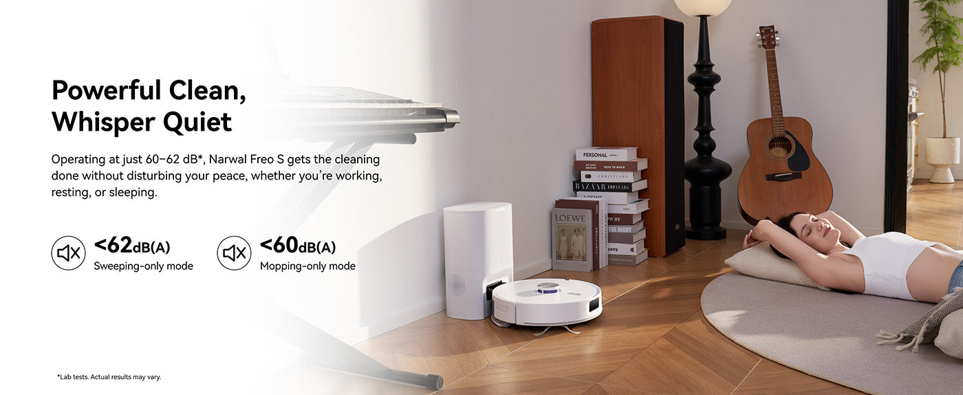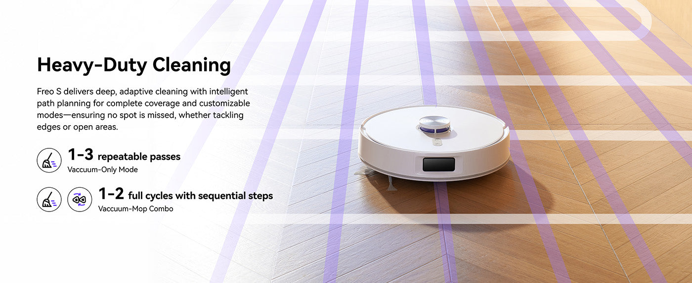8,000Pa Powerful Suction: Freo S is a high-performance robot vacuum cleaner built to remove everyday messes. With 8,000 Pa suction, it lifts dust, pet hair, and debris from carpets and hard floors with ease. *Actual performance may vary based on the floor type and dust level.